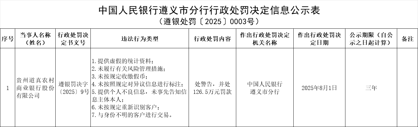 【大河财立方消息】8月8日消息,中国人民银行遵义市分行披露的行政处罚信息显示,因多项违法行为,贵州道真农村商业银行被警告,并处126.5万元罚款。
