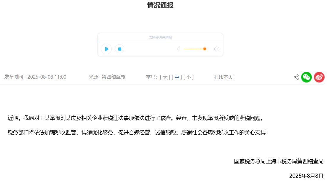【大河财立方消息】8月8日,国家税务总局上海市税务局第四稽查局发布情况通报称,近期,对王某举报刘某庆及相关企业涉税违法事项依法进行了核查。经查,未发现举报所反映的涉税问题。