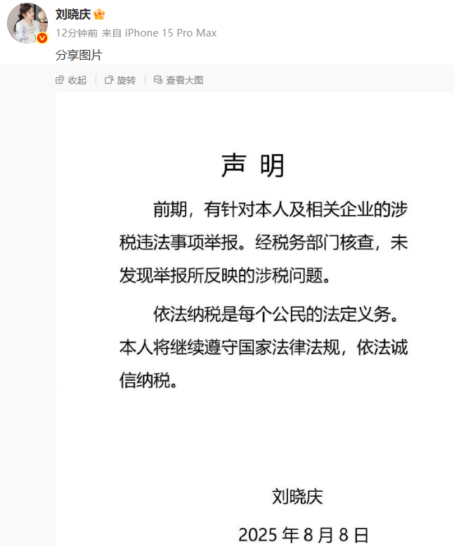 同时,刘晓庆微博发布声明称,“前期,有针对本人及相关企业的涉税违法事项举报。经税务部门核查,未发现举报所反映的涉税问题。依法纳税是每个公民的法定义务。本人将继续遵守国家法律法规,依法诚信纳税。”