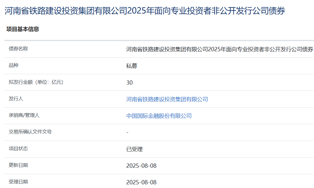 【大河财立方消息】8月8日,河南省铁路建设投资集团有限公司2025年面向专业投资者非公开发行公司债券项目获上交所受理。本期债券拟发行金额30亿元,承销商/管理人为中金公司。