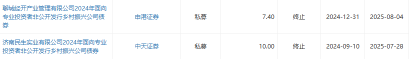 其中,“聊城经开产业管理有限公司2024年面向专业投资者非公开发行乡村振兴公司债券”项目状态更新为终止。该债券拟发行金额为7.4亿元,承销商/管理人为申港证券,受理日期为2024年12月31日;