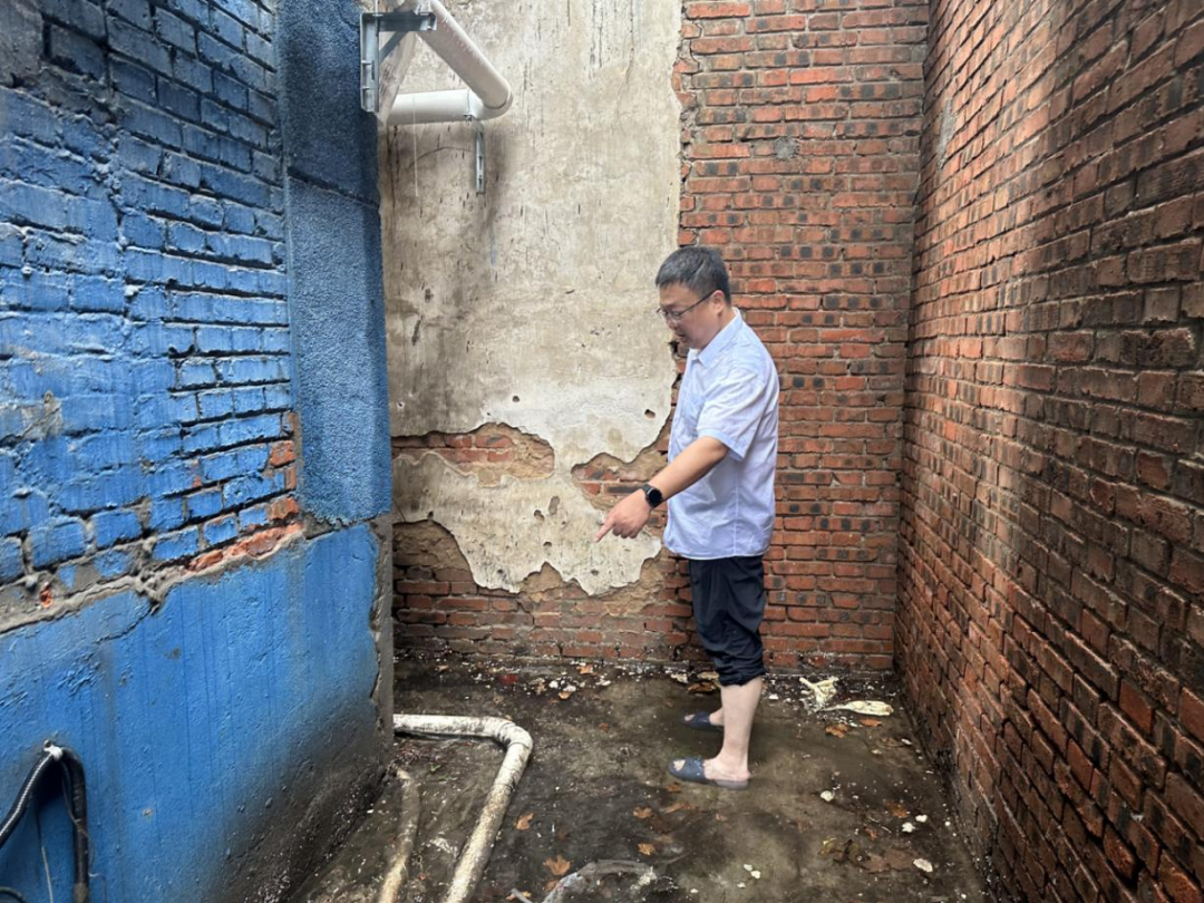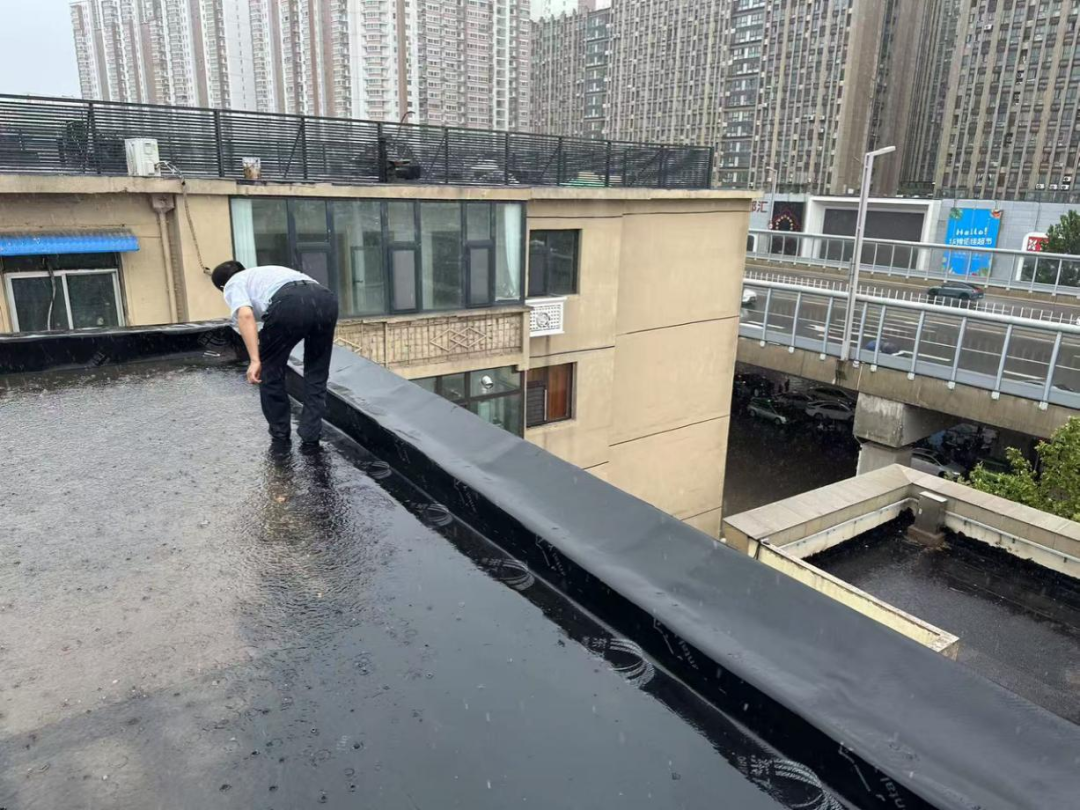 ▲工行河南郑州分行组织人员对楼顶、排水管等重点部位进行细致检查
