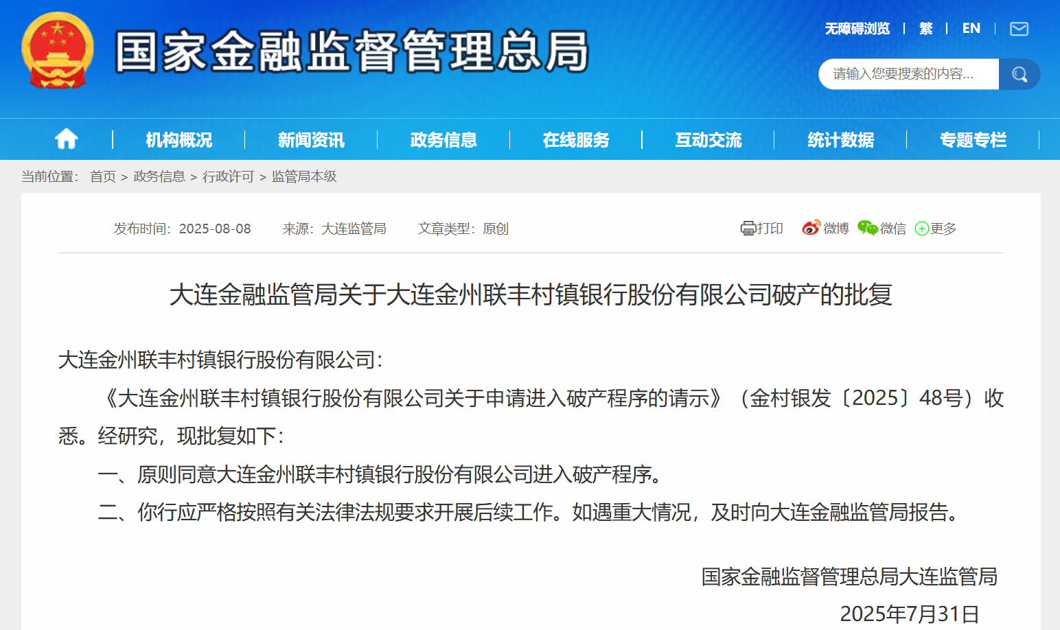 【大河财立方消息】8月9日消息,国家金融监督管理总局大连监管局日前发布关于大连金州联丰村镇银行股份有限公司破产的批复,原则同意大连金州联丰村镇银行股份有限公司进入破产程序。