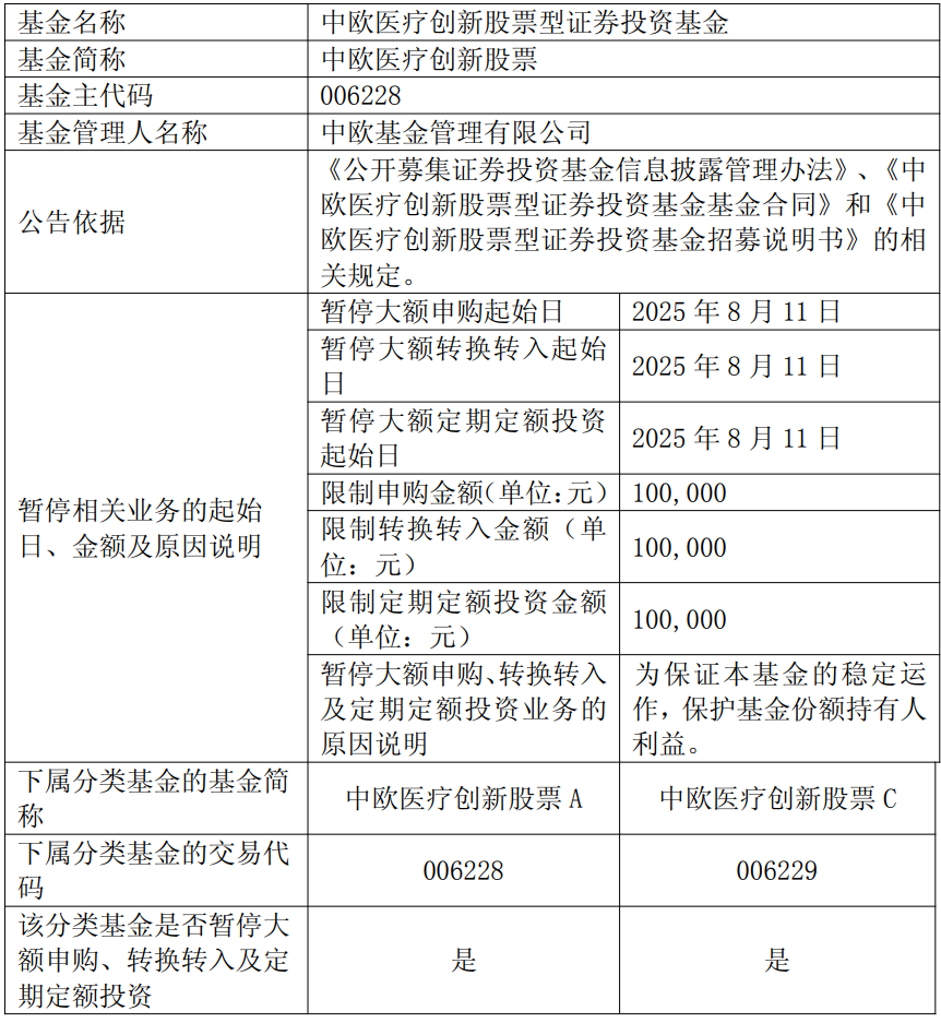 【大河财立方消息】8月9日,中欧医疗创新股票型证券投资基金发布公告,为进一步保证中欧医疗创新股票型证券投资基金的稳定运作,保护基金份额持有人利益,中欧基金管理有限公司决定自2025年8月11日(含)起,限制本基金的申购、转换转入及定期定额投资业务的金额。