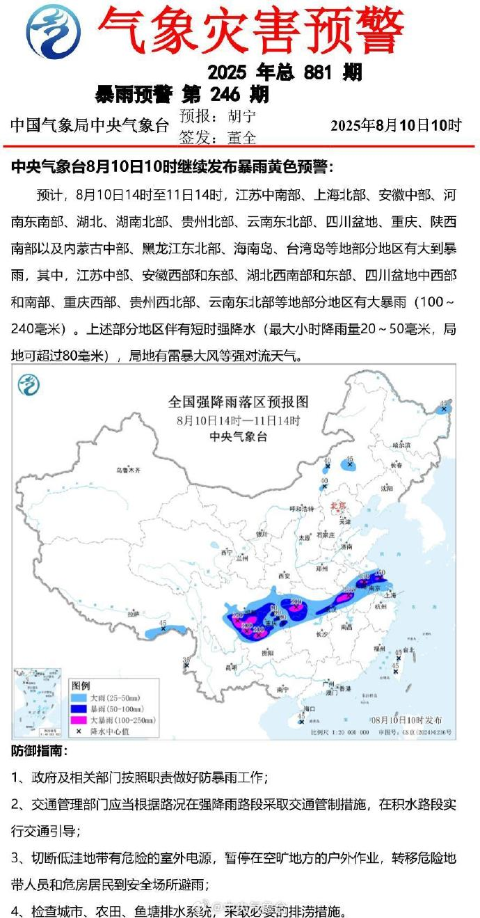 【大河财立方消息】中央气象台8月10日10时继续发布暴雨黄色预警:预计,8月10日14时至11日14时,江苏中南部、上海北部、安徽中部、河南东南部、湖北、湖南北部、贵州北部、云南东北部、四川盆地、重庆、陕西南部以及内蒙古中部、黑龙江东北部、海南岛、台湾岛等地部分地区有大到暴雨,其中,江苏中部、安徽西部和东部、湖北西南部和东部、四川盆地中西部和南部、重庆西部、贵州西北部、云南东北部等地部分地区有大暴雨(100~240毫米)。上述部分地区伴有短时强降水(最大小时降雨量20~50毫米,局地可超过80毫米),局地有雷暴大风等强对流天气。