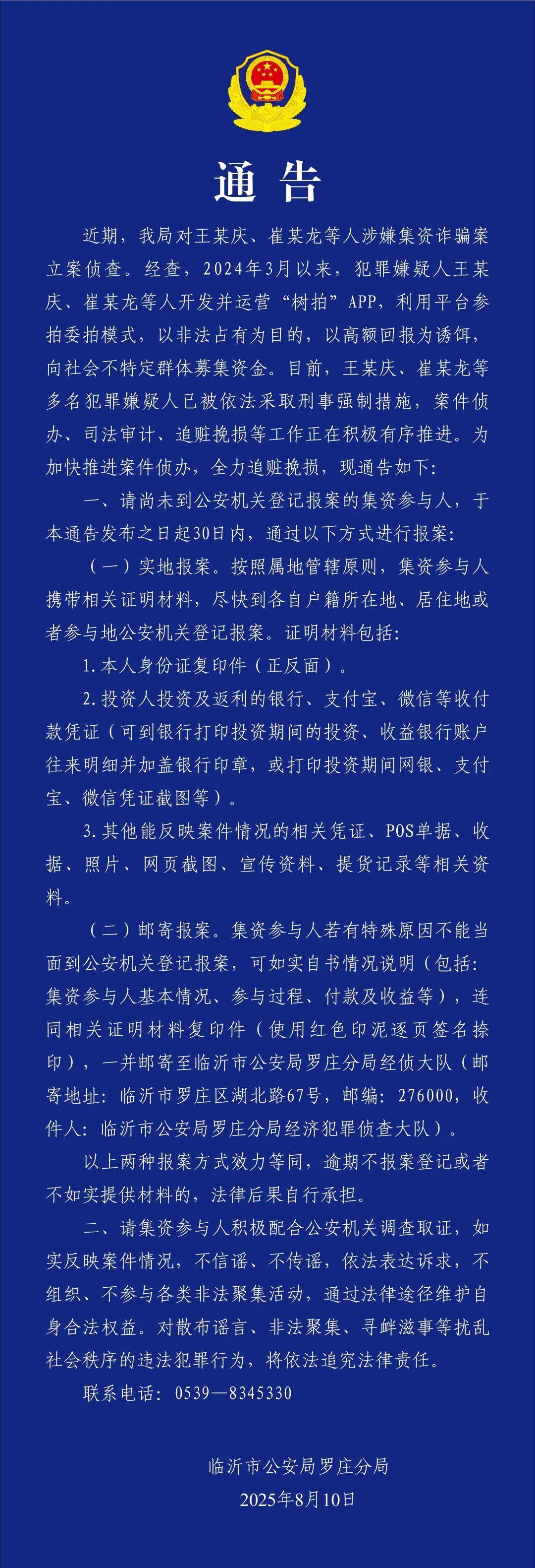 今天,山东临沂市公安局罗庄分局发布通告,称对王某庆、崔某龙等人涉嫌集资诈骗案立案侦查。经查,2024年3月以来,犯罪嫌疑人王某庆、崔某龙等人开发并运营“树拍”APP,利用平台参拍委拍模式,以非法占有为目的,以高额回报为诱饵,向社会不特定群体募集资金。目前,王某庆、崔某龙等多名犯罪嫌疑人已被依法采取刑事强制措施,案件侦办、司法审计、追赃挽损等工作正在积极有序推进。通告详情如下: