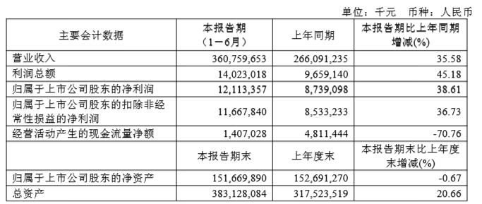 工业富联上半年实现营业收入3607.6亿元,同比增长35.58%;归属于上市公司股东的净利润121.13亿元,上年同期87.39亿元,同比增长38.61%;基本每股收益0.61元。