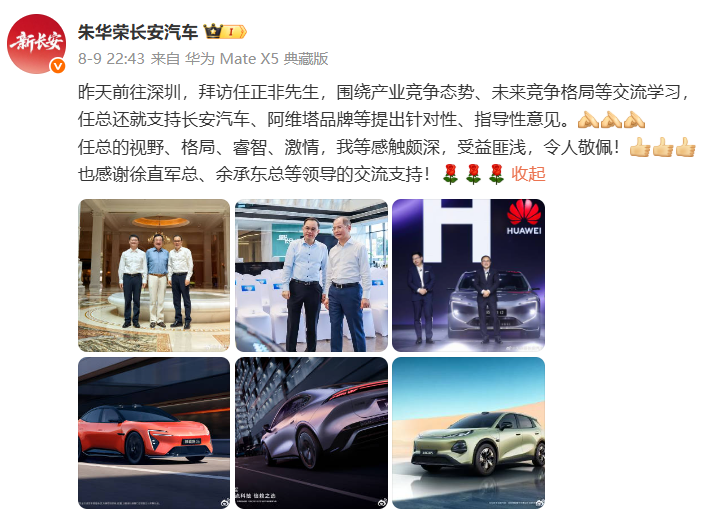 8月9日晚,中国长安汽车集团董事长朱华荣通过微博发文称,他近日前往深圳拜访了华为公司创始人兼CEO任正非,并围绕产业竞争态势、未来竞争格局等交流学习。任正非就支持长安汽车、阿维塔品牌等提出针对性、指导性意见。另外,朱华荣还对徐直军、余承东等华为高管的交流支持表达感谢。