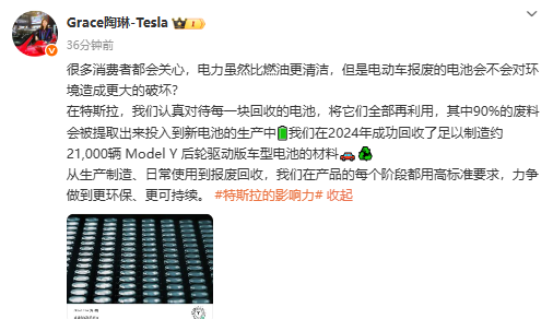 【大河财立方消息】8月11日,特斯拉公司全球副总裁陶琳在微博发文,谈特斯拉电池回收再利用问题。