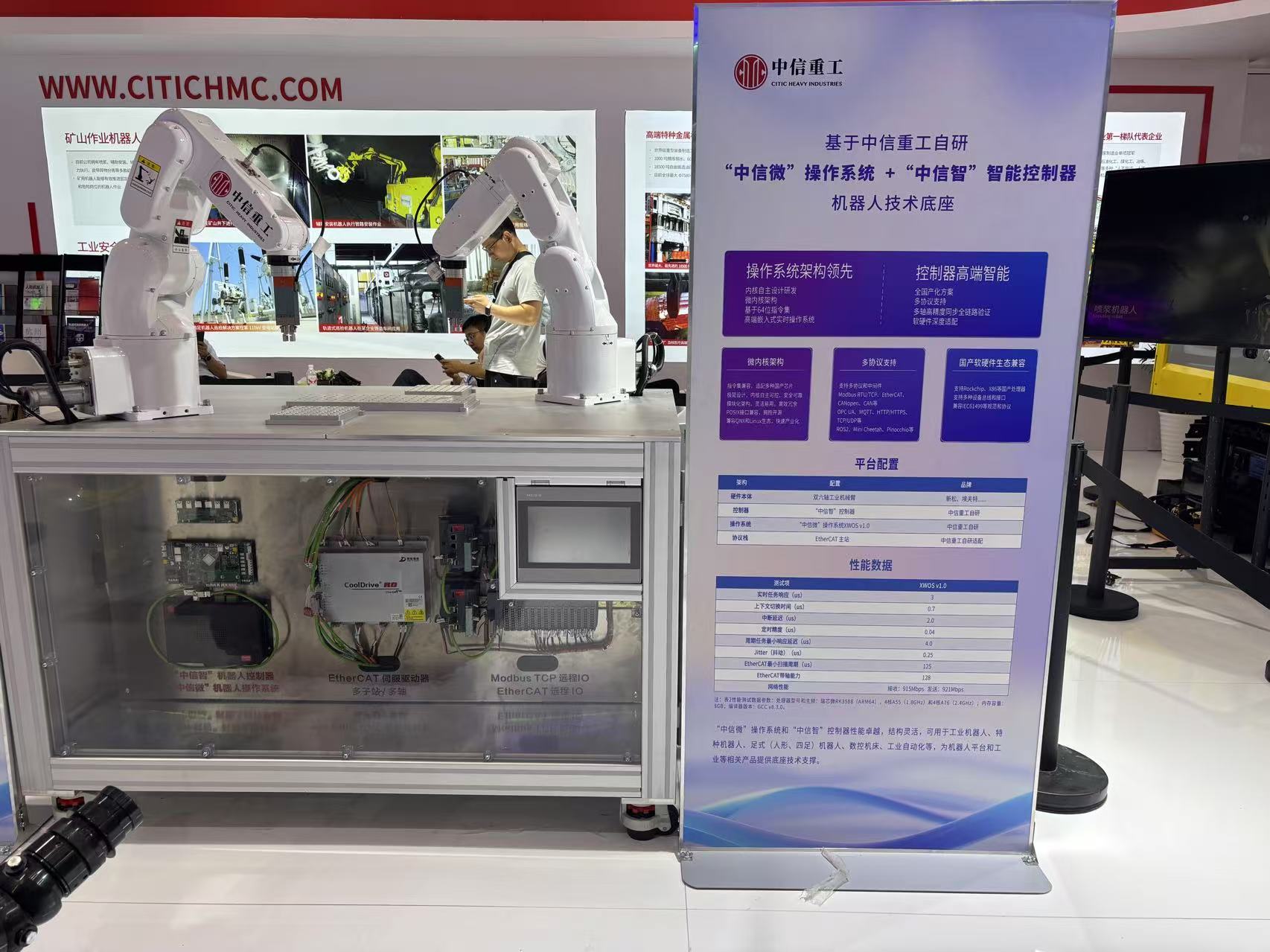 值得一提的是,这款智能作业人形机器人和现场展示的六轴协作机械臂、轮/履式消防灭火机器人一同搭载了中信重工自研的 “中信微” 机器人操作系统和完全国产化的 “中信智” 控制器,具有低时延、高可靠、高安全、易扩展等性能特点。