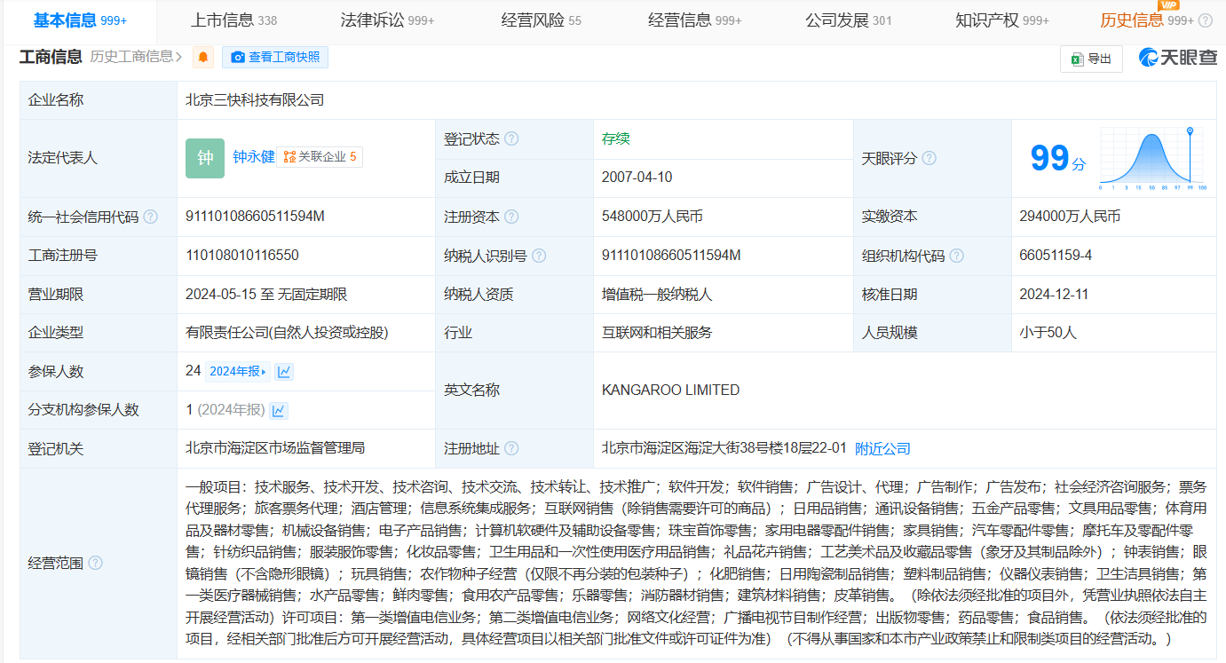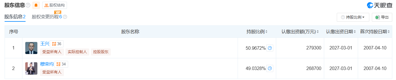 该公司成立于2007年4月,法定代表人为钟永健,注册资本约54.8亿元人民币,经营范围含软件开发、软件销售、票务代理服务、旅客票务代理、酒店管理、信息系统集成服务、互联网销售、日用品销售等。股东信息显示,该公司由王兴、穆荣均共同持股。