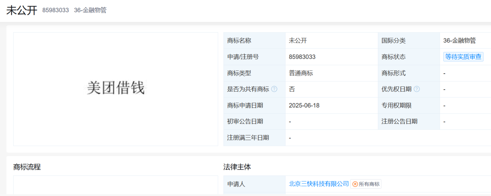 【大河财立方消息】8月11日消息,天眼查App显示,近日,美团关联公司北京三快科技有限公司申请注册一枚“美团借钱”商标,国际分类为金融物管,当前商标状态为等待实质审查。