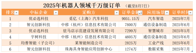 数据显示,截至8月7日,机器人领域共诞生6个千万级别订单,合计金额超3亿元,由优必选、智元机器人、宇树科技、均普智能(子公司)4家企业收入囊中。