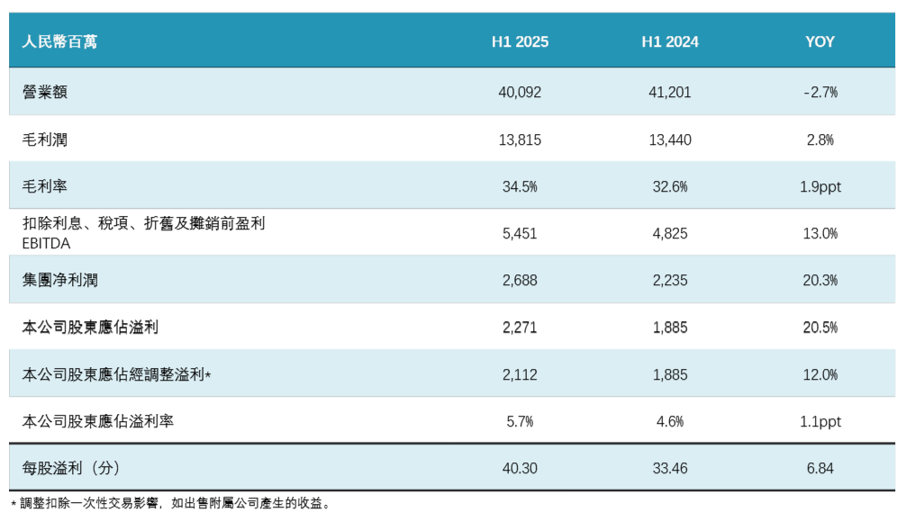分业务看,方便面收益同比下降2.5%,饮品收益同比下降2.6%。EBITDA同比增长13.0%至54.51亿人民币;受毛利率同比提高带动,公司股东应占溢利同比增长20.5%至22.71亿人民币。