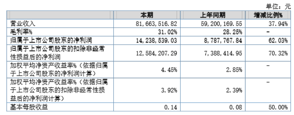 2025年上半年同心传动营业收入8166.35万元,同比增长37.94%。归属于上市公司股东的净利润为1423.85万元,同比增长62.03%。