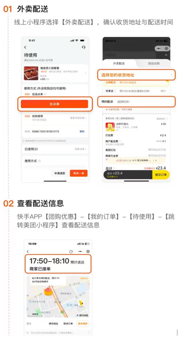 其实在此次上线独立入口前,快手已开始探索聚合外卖,2024年6月推出的团购配送到家业务,通过聚合外卖平台资源,上线即可实现全国覆盖并迅速接入大量商家资源。