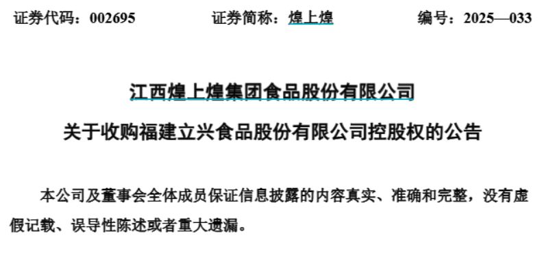 【大河财立方消息】8月11日,江西煌上煌集团食品股份有限公司(证券简称煌上煌)发布公告称,拟收购福建立兴食品股份有限公司(以下简称立兴食品)合计51%的股权,交易价格约为4.95亿元。