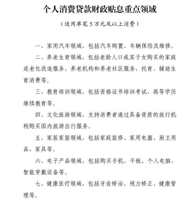 贴息范围包括单笔5万元以下消费,以及单笔5万元及以上的家用汽车、养老生育、教育培训、文化旅游、家居家装、电子产品、健康医疗等重点领域消费。对于单笔5万元以上的消费,以5万元消费额度为上限进行贴息。政策到期后,可视实施效果研究延长政策期限、扩大支持范围。