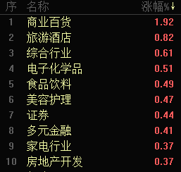 泛消费方向领涨,商业百货、旅游酒店、食品饮料等板块指数涨幅居前。