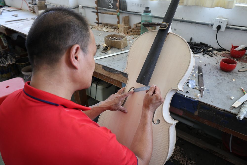 7月24日,在河南省驻马店市确山县的确山提琴产业园,一名工人在一家企业的工作室内制作提琴。