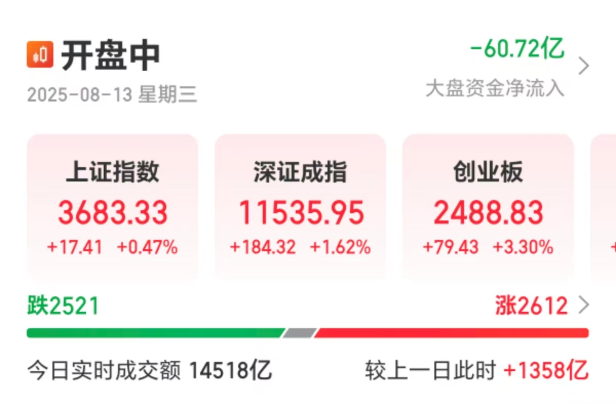 【大河财立方消息】8月13日,A股午后指数走强,创业板指拉升涨3.30%,沪指涨0.47%,深成指涨1.62%。证券、算力硬件、医药、军工等方向涨幅居前,沪深京三市上涨个股超2600只。