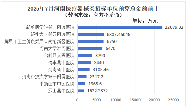 本月,预算总金额超过2亿元的招标单位有1家,5000万元—1亿元的有3家,3000万元—5000万元的有3家,1000万元—3000万元的有9家,其余均在1000万元以下。具体来看,新乡医学院第一附属医院以2.21亿元位列7月招标单位预算总金额第1,这是今年以来首次有招标单位单月预算金额超过2亿元;其次是郑州大学第五附属医院,预算总金额为6807.46万元;辉县市卫生健康委员会南湖新区医院以6750万元排在第3位,该医院本月仅有一个招标项目。