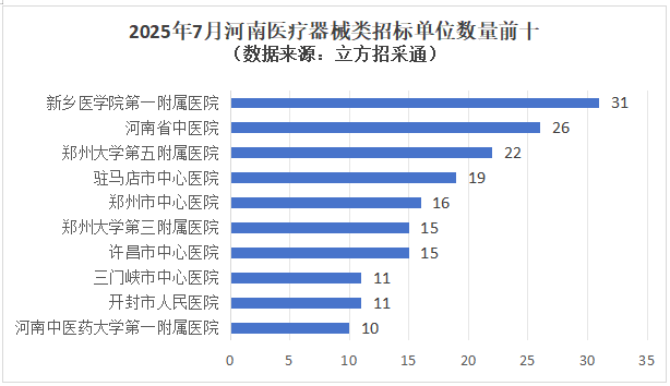 从招标单位看,数量上新乡医学院第一附属医院以31个位居榜首,其次是河南省中医院和郑州大学第五附属医院,招标数量分别为26个和22个。