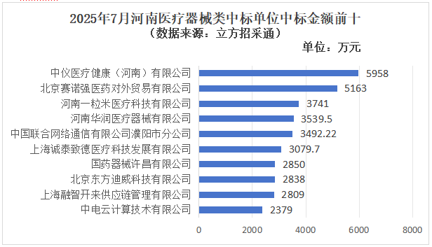 在中标总金额方面,中仪医疗健康(河南)有限公司以5936万元成为7月中标总金额最高的企业,该公司5月份中标5个项目。(获取详细中标数据,请添加立方招采通客服微信:SK_lifangzct)