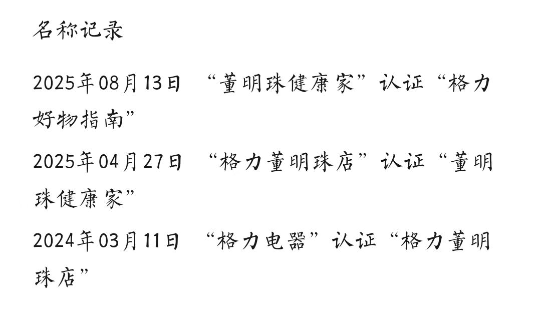 该账号的名称记录显示,2024年3月11日,“格力电器”认证“格力董明珠店”;2025年4月27日,“格力董明珠店”认证“董明珠健康家”;2025年8月13日,“董明珠健康家”认证“格力好物指南”。