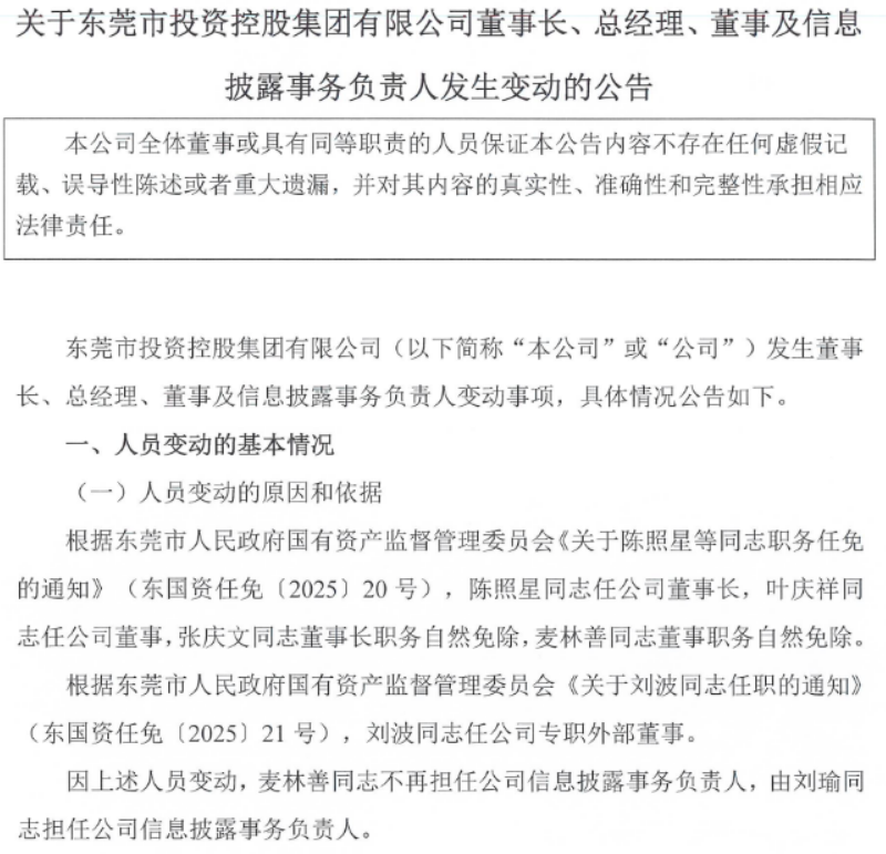 东莞投控集团公告提到,根据东莞市国资委有关通知,陈照星任公司董事长,叶庆祥任公司董事,张庆文董事长职务自然免除,麦林善董事职务自然免除。刘波任公司专职外部董事。