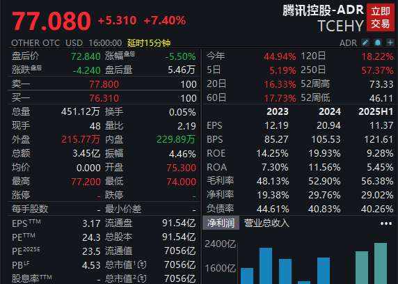 【大河财立方消息】8月14日消息,腾讯控股ADR大涨7.4%,推动腾讯市值达7056亿美元。以最新汇率计,腾讯市值达人民币5.06万亿元。