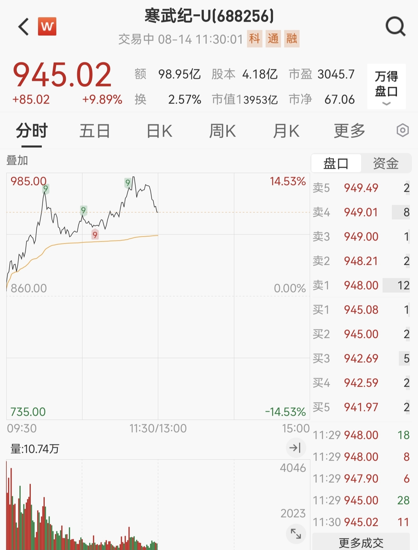 【大河财立方 记者 王宁宁】8月14日,上证指数盘中一度突破3700点关口,GPU、半导体等指数涨幅居前,“寒王”寒武纪-U(688256.SH)盘中一度涨超14%,股价最高触及985元/股,续创历史新高,总市值一度突破4000亿元。截至发稿,其股价上涨9.89%报945.02元/股。