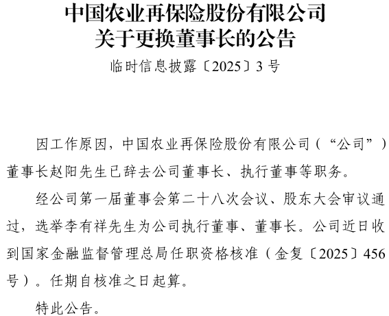 【大河财立方消息】8月14日消息,中国农业再保险股份有限公司(以下简称中国农业再保险)近日发布公告称,赵阳已辞去公司董事长、执行董事等职务,李有祥任公司执行董事、董事长。中国农业再保险近日收到金融监管总局任职资格核准,任期自核准之日起算。