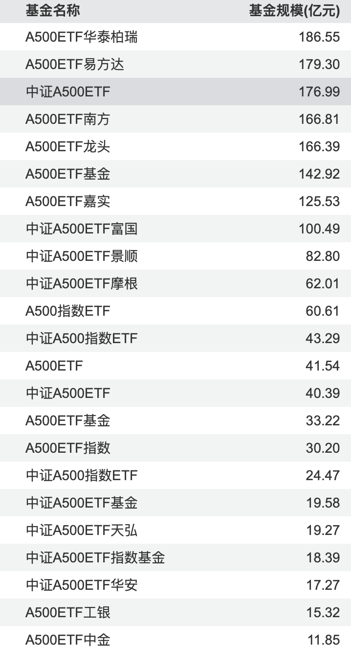 Wind数据显示,截至2025年8月,首批10只产品规模大多较首发时有所下滑,最大缩水超过100亿元。与此同时,全市场中证A500ETF数量仍在增加,达到32只。
