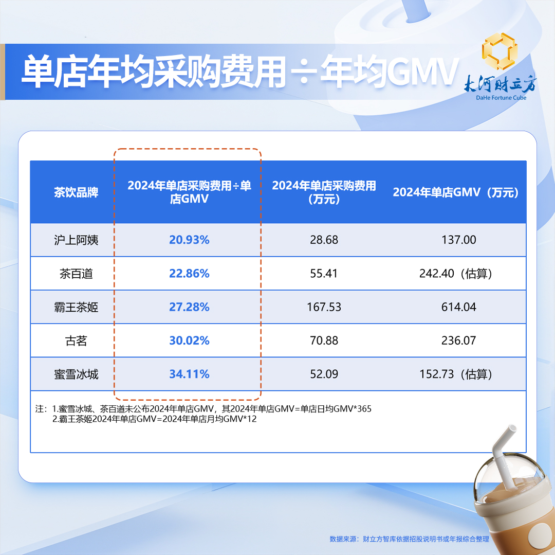 数据显示,2024年蜜雪冰城以34.11%位居榜首。换句话说,蜜雪冰城加盟店每卖一杯34%要付给总部;沪上阿姨则以20.93%的占比表现最优;茶百道、霸王茶姬、古茗处于中间水平,比例分别为22.86%、27.28%和30.02%。尽管霸王茶姬的绝对采购额远超同行,但其27.28%的占比却优于蜜雪冰城的34.11%。这也反映了高端奶茶品牌通过高客单价一定程度上减轻了压力。