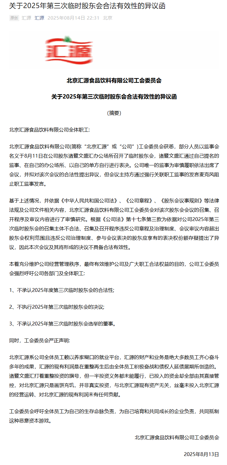 【大河财立方消息】8月14日,北京汇源食品饮料有限公司工会委员会发布关于2025年第三次临时股东会合法有效性的异议函。