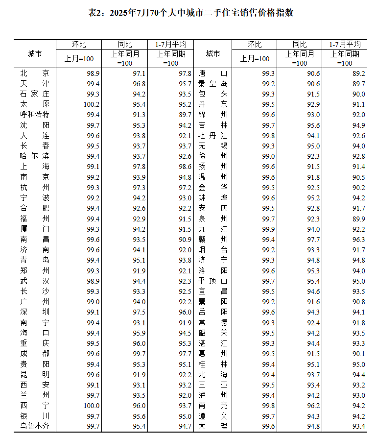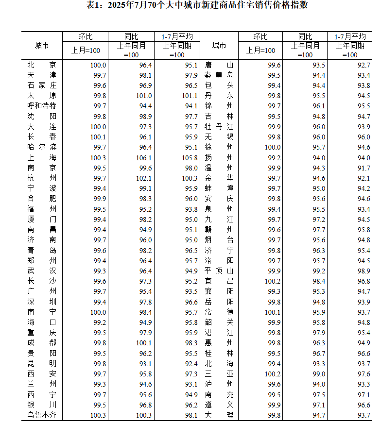 【大河财立方消息】8月15日,国家统计局发布2025年7月份70个大中城市商品住宅销售价格变动情况。