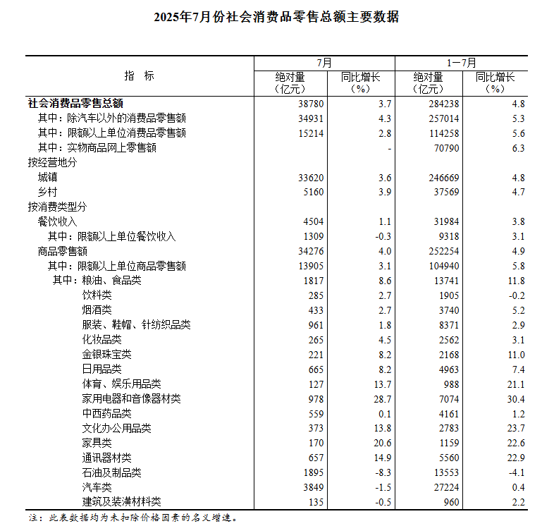按经营单位所在地分,7月份,城镇消费品零售额33620亿元,同比增长3.6%;乡村消费品零售额5160亿元,增长3.9%。1—7月份,城镇消费品零售额246669亿元,增长4.8%;乡村消费品零售额37569亿元,增长4.7%。