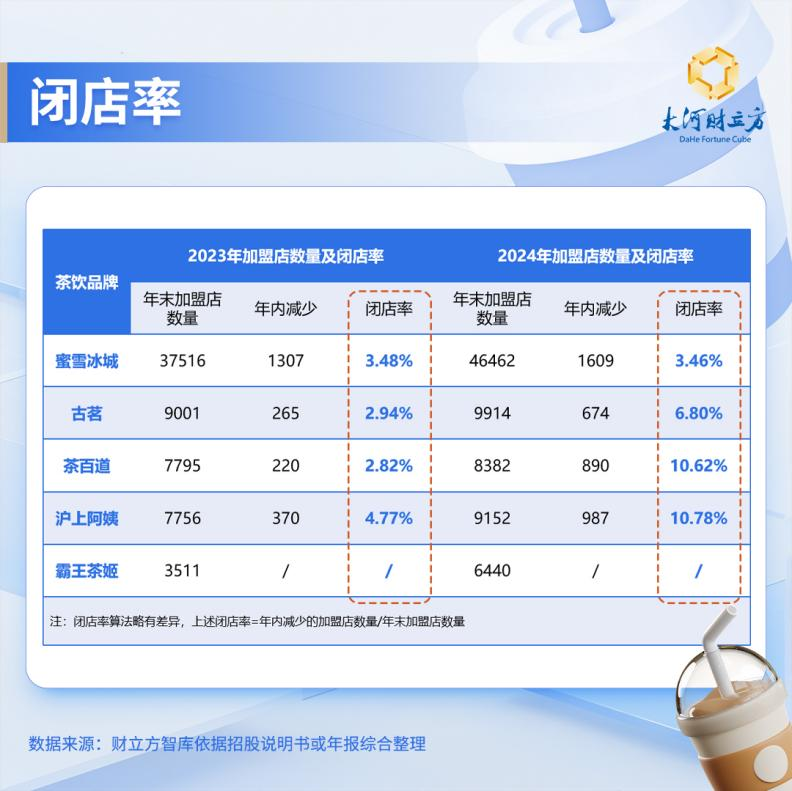 详细来看,2024年沪上阿姨以10.78%的闭店率位居榜首,全年关闭加盟店987家;茶百道次之,2024年闭店率为10.62%,关闭890家,而2023年其闭店率仅为2.82%;古茗闭店率为6.80%,相对较低。