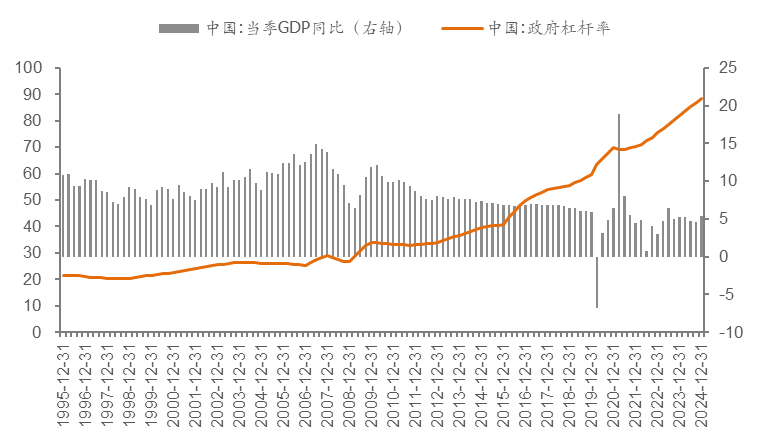 NIFD还进一步区分了中央政府杠杆率和地方政府杠杆率,疫情以来中央、地方政府杠杆率均持续上升,分别从2019年末的16.7%、21.2%上升至2025年一季度末的26.4%、36.8%,说明地方政府的杠杆率水平上升更快,主要原因是近年来发行地方政府专项债券。可以看到,疫情以来政府部门杠杆率呈现明显上升趋势,但GDP累计增速则稳中略缓,说明仅靠政府部门加杠杆已难以有效带动GDP快速增长,也即通过举债支撑经济增长的效率下降。