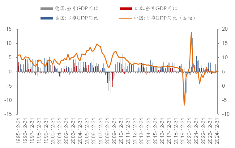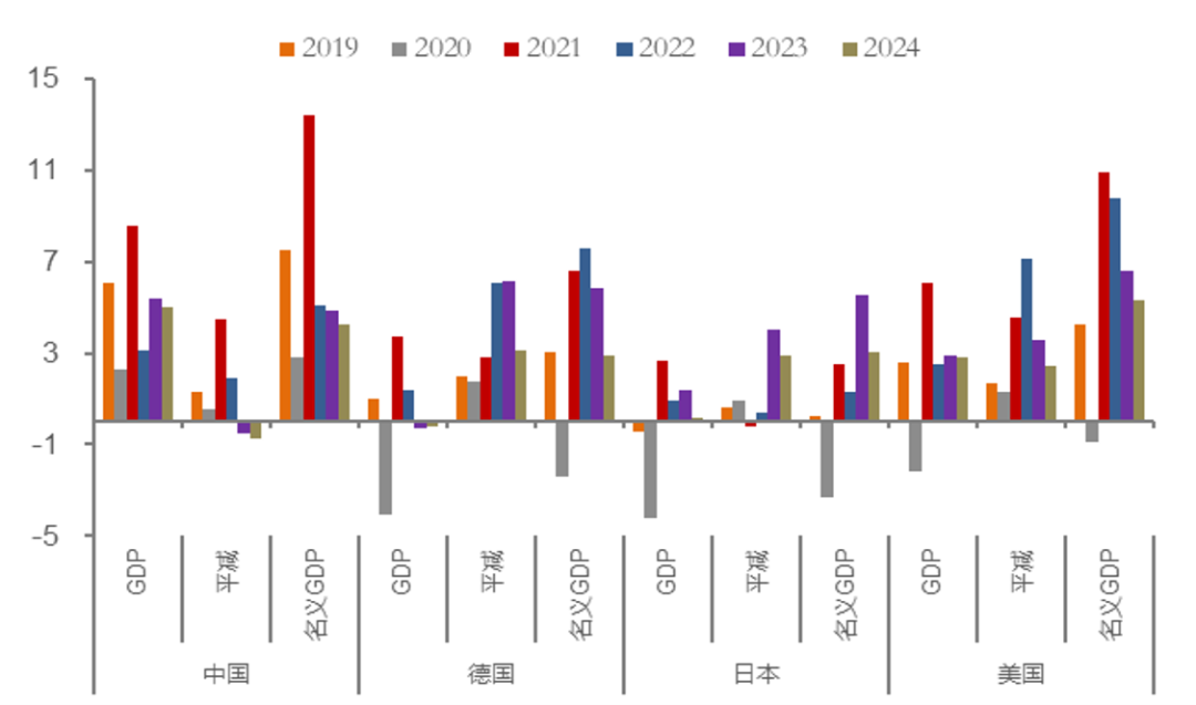 宏观杠杆率的变化取决于债务规模变化(新增债务、市场价值计价下利率水平变化对存量债务的影响)与GDP规模规模(实际GDP增速、平减指数变化)的相对关系。从实际GDP增速看,2020-2024年我国各年度实际经济增速分别为2.3%、8.6%、3.1%、5.4%、5%,均快于同期德、日、美增速;但从平减指数看,2023、2024年我国GDP平减指数同比分别下降0.51%、0.71%,均弱于同期德、日、美价格水平。