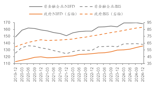 关于政府部门杠杆率的具体计算,这里还有两点需要特别说明:一是统计口径问题。BIS与我国国家金融与发展实验室(NIFD)对于我国的政府部门杠杆率数据存在差异,主要原因是BIS将部分与政府联系紧密的非金融企业债务(可能是地方政府隐性债务)计入政府部门杠杆,而NIFD仍计入非金融企业杠杆。从两者差异看,2024年末BIS口径下的非金融企业杠杆率比NIFD口径下低30.3个百分点,而BIS口径下的政府杠杆率比NIFD口径下高27.6个百分点,差异大体相当。