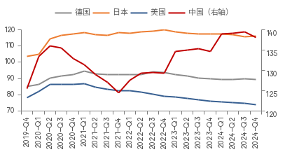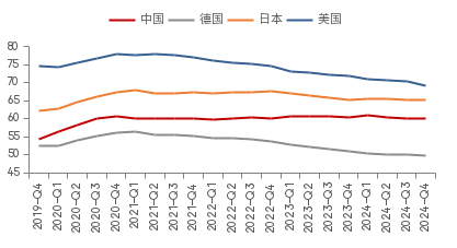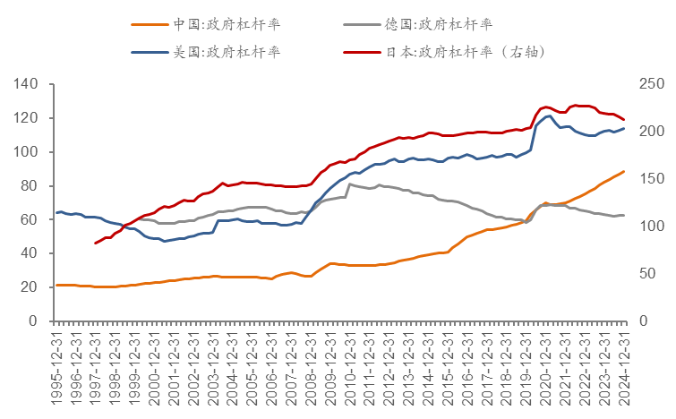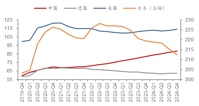 同样值得关注的是,近年来中国政府部门杠杆率持续增长,德、日、美则先升后落。我国政府杠杆率从2019年末的59.6%持续上升至2024年末的88.4%。但德国政府从2019年末的58.6%升至2021年末的68.9%,此后逐步回落至2024年末的62.4%;而日、美政府杠杆率分别从2019年末的203.4%、99.5%升至2021的225.3%、121.4%,此后回落至2024年末的212.5%、114.1%。