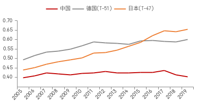 图16 按经济发展水平调整后中、德、日的TFP(同期美国=1)