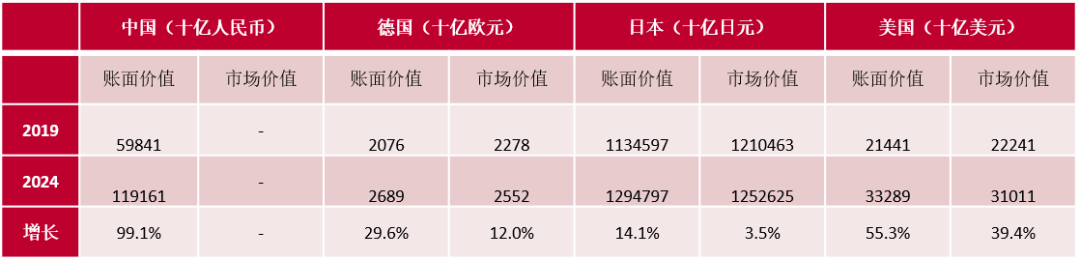 那么账面价值和市场价值计价的政府债务差异有多大,差异的原因又是什么?根据BIS给出的以各国本币计价的政府债务,中国账面价值计价的政府债务2024年末比2019年末接近翻一倍,而德、日、美账面价值计价的政府债务分别上升29.6%、14.1%、55.3%。但德、日、美市场价值计价的政府债务上升幅度明显小于账面价值计价,分别为12%、3.5%、39.4%。