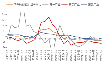 拆分三次产业来看,我国一、二、三产业平减指数均同比走弱,第一产业平减自2023年二季度以来已连续9个季度同比负增,第二产业平减自2022年四季度以来连续11个季度同比负增,第三产业平减也在2024年后三个季度和今年二季度出现负增长。价格水平低迷不利于名义GDP规模增长,也不利于宏观杠杆率下降。