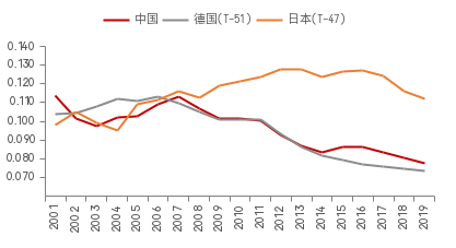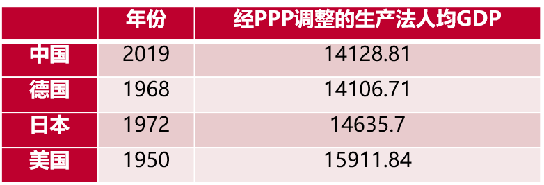 使用Penn World Table 10.01(数据更新至2019年),考虑到我国按生产法计算GDP,通过经PPP调整的生产法GDP除以当年总人口数,计算出人均GDP,找到与中国处于相同发展水平时期的德国、日本、美国的对应年份。由于数据起始时点1950年美国经PPP调整的生产法人均GDP高于中国2019年水平,后续仅对中、德、日三国进行比较。将德、日的数据分别按照T-51年、T-47年进行调整,使中、德、日处于相同经济发展水平(比如,中国的2019年对应德国的1968年、日本的1971年)。