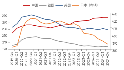 根据BIS数据,2019年末,中、德、日、美四国非金融部门宏观杠杆率分别为239.5%、202%、382.9%、256.3%,到2024年末,四国宏观杠杆率依次为286.5%、198.6%、387%、249.3%,中国的上升幅度最为明显。从变化态势看,德、日、美为“急升-回落”,三国的宏观杠杆率在2020年均明显上升,在2021年一季度或二季度开启下降趋势,到2024年末回落至与2019年末大体相当水平;但中国的宏观杠杆率总体上稳步上升。