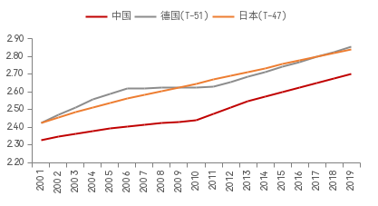 注:中国所处年份为T,德国为T-51,日本为T-47;人力资源指数根据受教育年限和教育回报编制。
