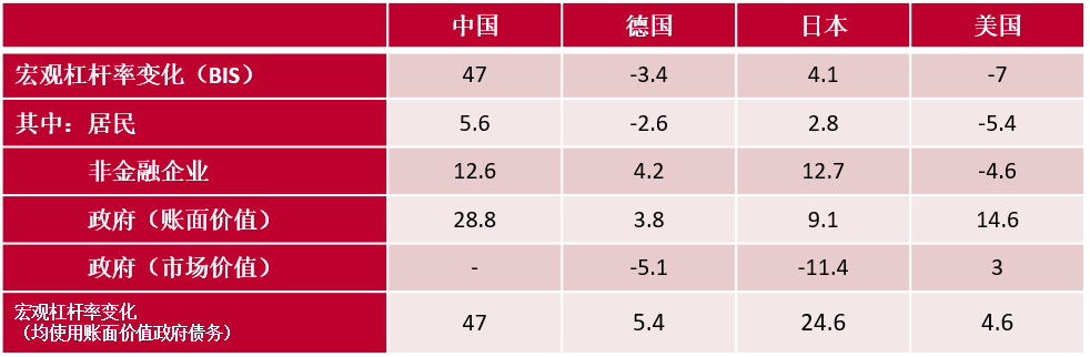 如果将宏观杠杆率变化统一为居民、企业、政府(账面价值)杠杆率变化的总和,则德、日、美宏观杠杆率也均有所上升,只是上升幅度小于中国。